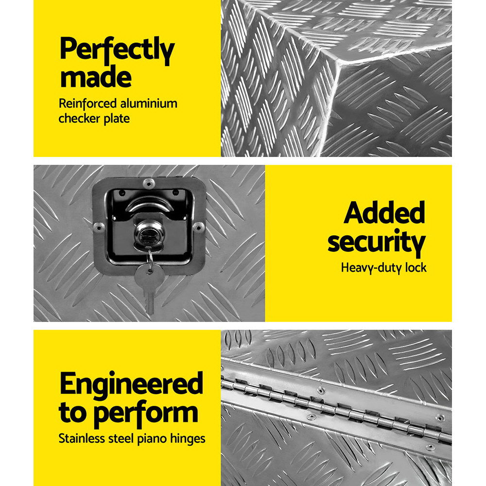 For reliable and safe tools storage, nothing beats our Giantz Aluminium Under Tray Tool Box, designed to fit under the ute tray beside the wheel guard. Made of heavy-duty aluminium with a checker plate finish, this tool box is constructed with stainless steel piano hinges, reinforced lid and strong sidewalls. The high-quality rubber sealing and fully welded seams also help to keep your precious equipment and tools clean and dry from the weather elements. Better still, the front opening lid ensures easy access and storage of your tools with minimum hassle, and the chain stays provide durable lid support to keep it open at a 90° angle. Not least, the tool box is equipped with a heavy-duty T–handle lock with two keys for added security at all times. Best of all, with our tool box installed under your ute, you can free up the space on your ute tray and still take your tools wherever they are needed.