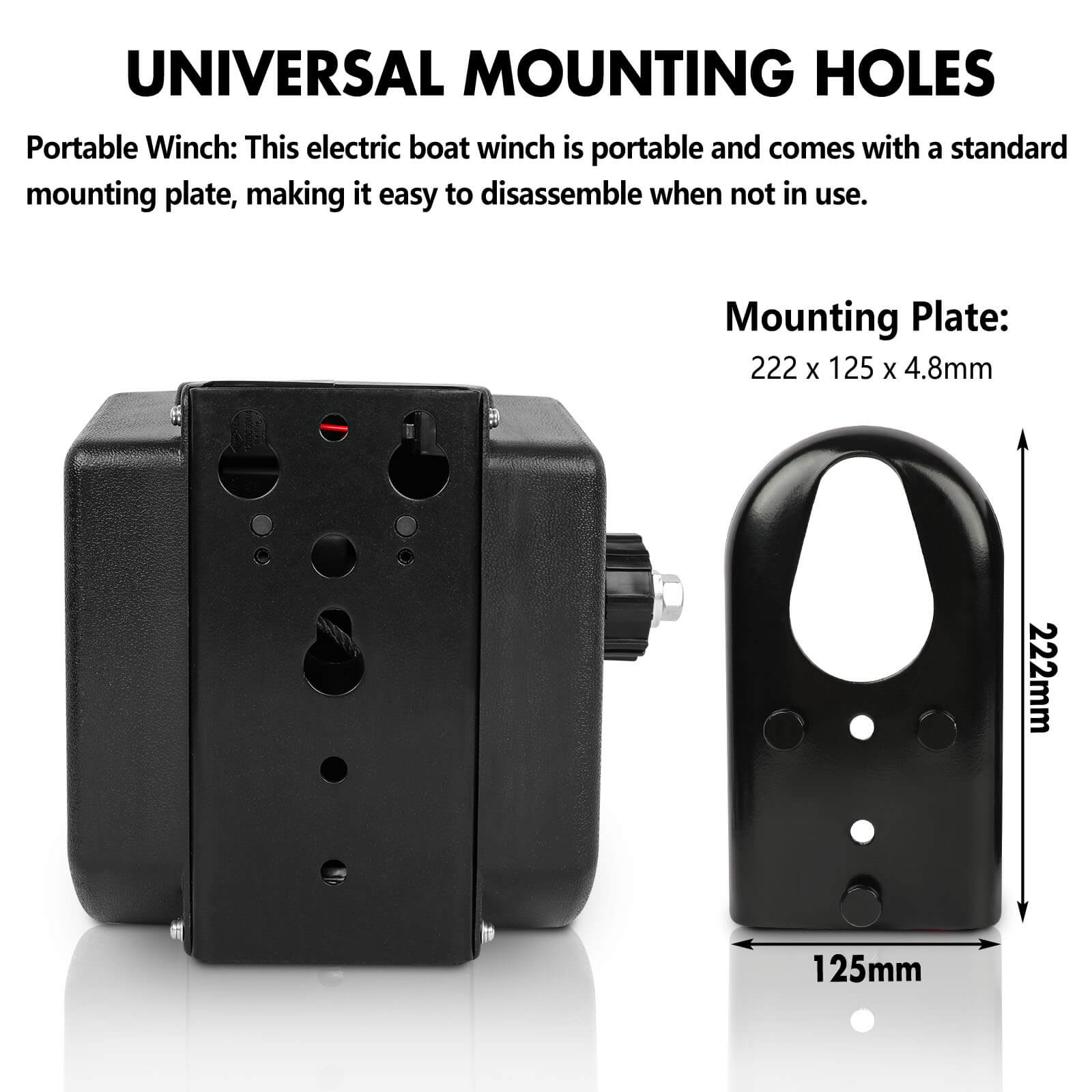 Portability & Detachability: This electric boat winch is portable with an anti-slip handle and a tri-point mounting plate for easy detachment when not in use.