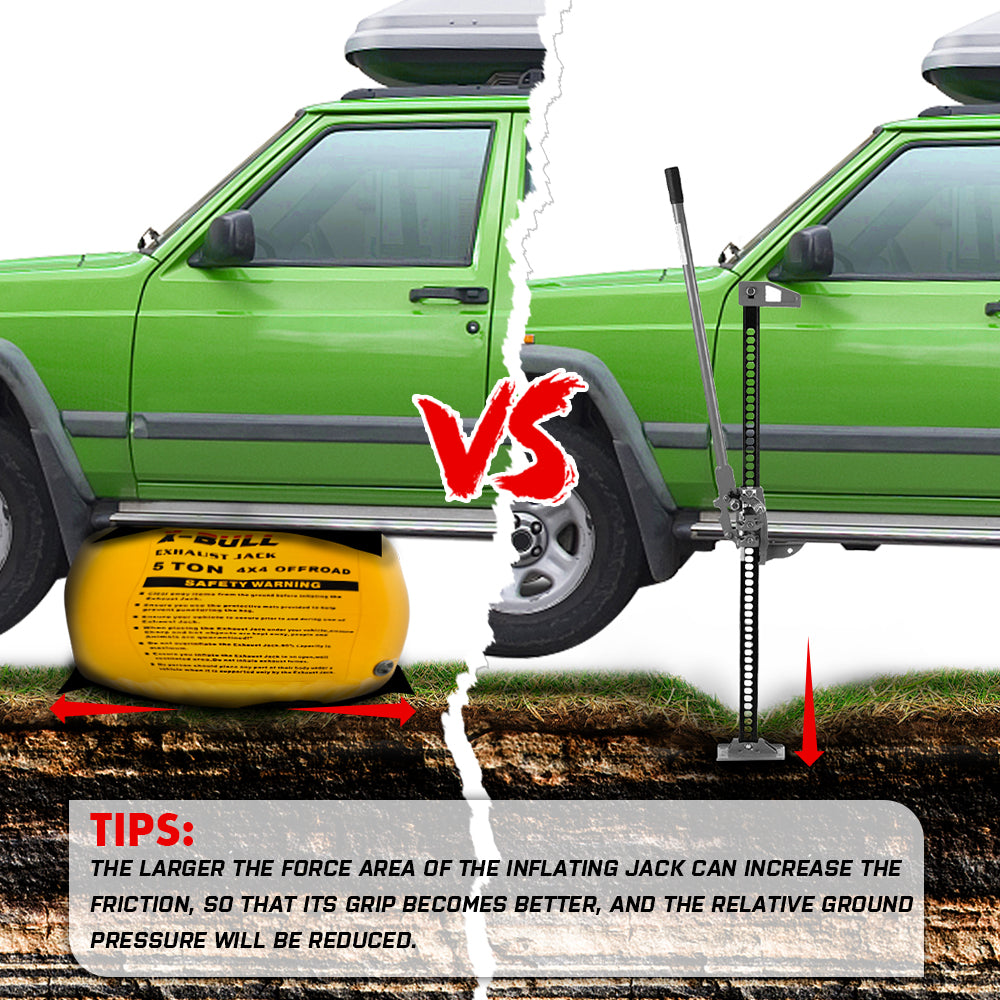 [Unique role] The exhaust jack can be used on hard ground and special terrain such as sand, mud and snow. Air jack can lift up to 5000kg of vehicles, which is equivalent to the weight of a truck. Therefore, the jacks can be applied to most car.